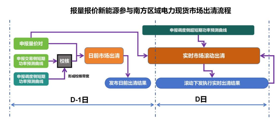 流程關(guān)鍵節(jié)點(diǎn)包括:日前市場:D-1日(交易日前一天)向調(diào)度機(jī)構(gòu)申報(bào)電廠短期功率預(yù)測曲線并形成校核帶寬,向交易機(jī)構(gòu)申報(bào)日前市場預(yù)測曲線、申報(bào)電能量報(bào)價曲線;隨后開展日前市場出清(發(fā)布日前出清結(jié)果)。實(shí)時市場:D日(交易日)實(shí)時市場計(jì)算開始前,向調(diào)度機(jī)構(gòu)上傳超短期功率預(yù)測曲線,采用日前封存的電能量報(bào)價曲線;通過實(shí)時市場滾動出清,并滾動下發(fā)執(zhí)行實(shí)時出清結(jié)果。