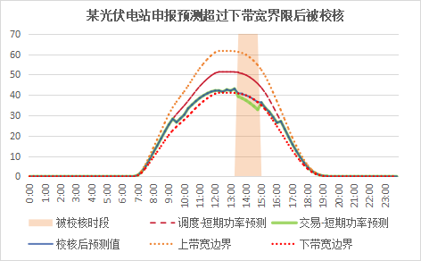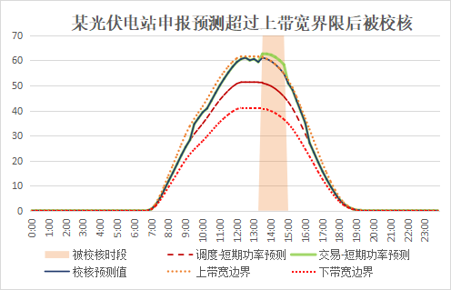 在可靠性機(jī)組組合與日前市場尚未完全分離的過渡階段,為避免潛在金融交易意愿對電力系統(tǒng)可靠性產(chǎn)生干擾,影響系統(tǒng)安全穩(wěn)定運(yùn)行,需用短期功率預(yù)測曲線形成校核帶寬對新能源主體申報(bào)的“日前市場預(yù)測曲線”進(jìn)行校核。具體為:以該主體日前上傳的“短期功率預(yù)測曲線”為基準(zhǔn),其±20%的范圍即為“日前曲線校核帶寬”;若“日前市場預(yù)測曲線”超出此帶寬限值,超出部分將按帶寬限值進(jìn)行處理。未來可靠性機(jī)組組合與日前市場完全分離后,預(yù)計(jì)校核機(jī)制將逐步取消。
