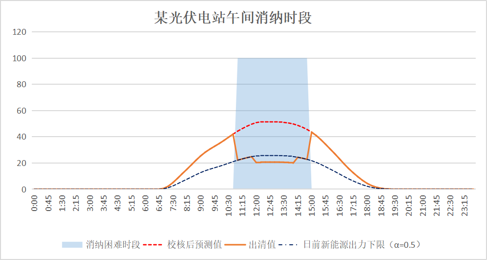② 12:00起:消納形勢嚴(yán)峻,供大于求矛盾加劇,即使用盡現(xiàn)貨市場調(diào)節(jié)手段,市場優(yōu)化空間仍無法實(shí)現(xiàn)供需平衡,新能源出清出力只能突破α下限,低至20兆瓦;