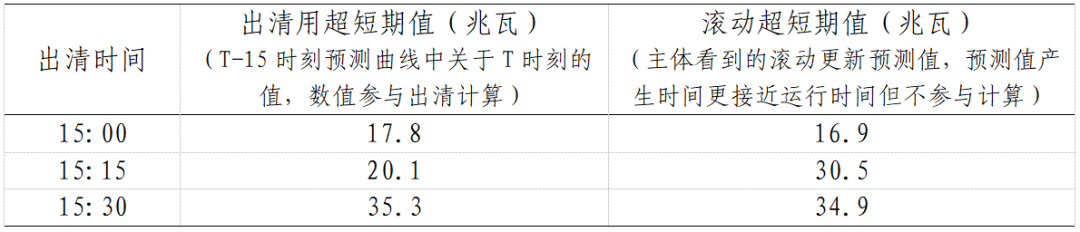 ? 超短期功率預(yù)測曲線:由新能源電廠在D日實(shí)時運(yùn)行時刻前15分鐘上傳調(diào)度機(jī)構(gòu),至少覆蓋未來6小時共24個時間點(diǎn)的功率預(yù)測曲線,用于實(shí)時市場出清。若新能源電廠未能上傳超短期預(yù)測數(shù)據(jù),導(dǎo)致超短期曲線缺失,優(yōu)先按照“時間由近及遠(yuǎn)”的原則,依次遞補(bǔ)沿用最近一次的預(yù)測值。