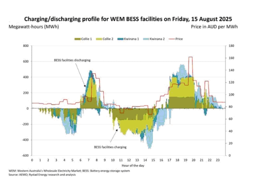 圖1在西澳大利亞州批發(fā)電力市場(WEM)運(yùn)營的電池儲能系統(tǒng)在8月15日的充放電情況