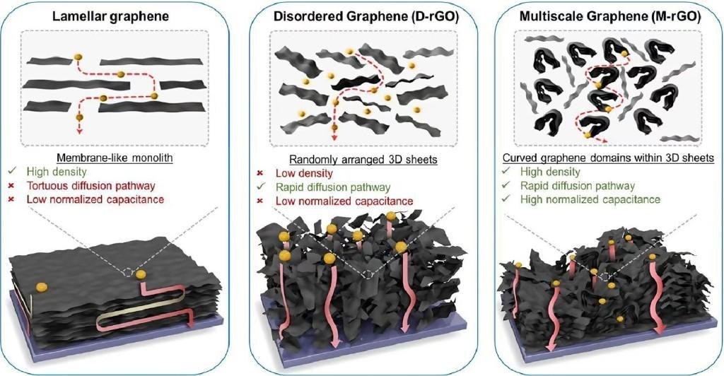 這項(xiàng)突破的核心在于一種名為“多尺度還原氧化石墨烯”的新型材料結(jié)構(gòu)。研究團(tuán)隊(duì)使用澳大利亞豐富的天然石墨,通過(guò)快速熱退火工藝,形成了一種高度彎曲的石墨烯結(jié)構(gòu),為離子提供了高效遷移的路徑,最終使材料同時(shí)具備高功率和高能量密度——這一組合在單一器件中極為罕見(jiàn)。