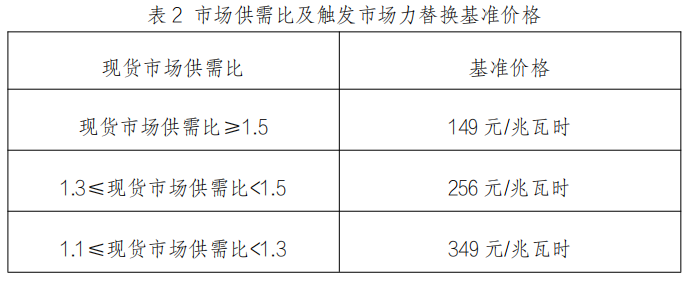 報(bào)價(jià)替換出清方面,供需比范圍內(nèi)將觸發(fā)市場力監(jiān)測的該類型電源高于基準(zhǔn)價(jià)格的報(bào)價(jià)段進(jìn)行替換,按替換后報(bào)價(jià)進(jìn)行日前及實(shí)時(shí)市場出清。替換價(jià)格暫定標(biāo)準(zhǔn)如表2所示,供需比范圍及對應(yīng)替換價(jià)格由政府相關(guān)部門進(jìn)行明確,后續(xù)進(jìn)行調(diào)整。當(dāng)同一類型電源連續(xù)5日未通過事前監(jiān)管時(shí),如第6日繼續(xù)未通過事前監(jiān)管,則從第6日起按替換基準(zhǔn)價(jià)格的0.95倍執(zhí)行,直至該類型電源通過事前監(jiān)管后恢復(fù)。