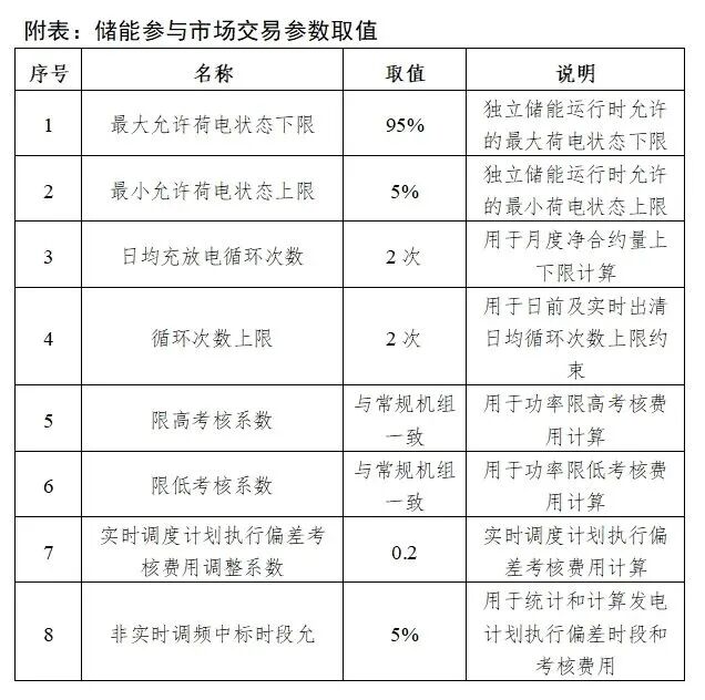 獨(dú)立儲(chǔ)能以充電和放電兩個(gè)獨(dú)立交易單元參與中長期電能量交易,充電交易單元參照用電側(cè)購電單元管理(不可被售電公司代理),放電交易單元參照發(fā)電側(cè)售電單元管理。儲(chǔ)能參與市場(chǎng)交易參數(shù)取值詳見附表。