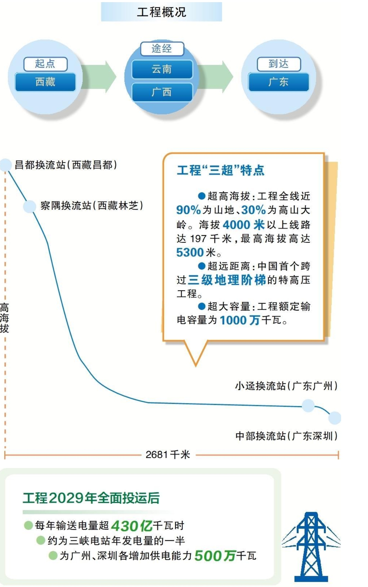 藏粵直流輸電工程輸電線路全長約2681千米,自西向東跨越西藏、云南、廣西、廣東四?。ㄗ灾螀^(qū)),依托西藏玉曲河、察隅曲、克勞龍河等流域“水風光一體化”清潔能源基地,在送端西藏昌都、林芝及受端廣東廣州、深圳共建設四座±800千伏特高壓換流站。工程額定輸電容量1000萬千瓦,總投資約532億元。藏粵直流輸電工程是西藏清潔電力送出的首條多端特高壓柔性直流工程,將助力西藏將資源優(yōu)勢轉化為經(jīng)濟優(yōu)勢,為粵港澳大灣區(qū)提供強有力的清潔電力支撐。