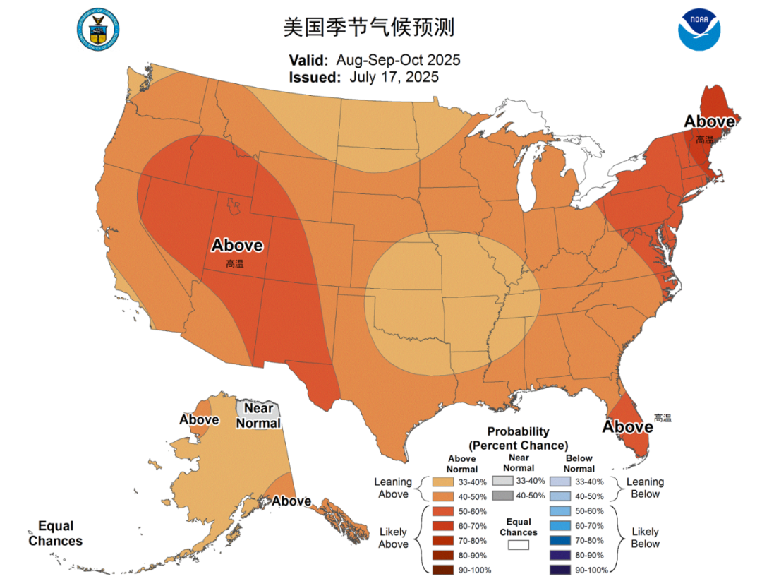 極端天氣多發(fā)、頻發(fā)、強發(fā)或?qū)﹄娏υO(shè)備可靠運行和機組平穩(wěn)出力造成顯著影響。今年夏季期間,極端高溫大范圍蔓延,美國大部分地區(qū)夏季氣溫高于常年平均水平。其中,西部的內(nèi)華達州、猶他州和新墨西哥州大部地區(qū)、亞利桑那州東北部、俄勒岡州和愛達荷州南部,以及東北部的紐約州、賓夕法尼亞州、新澤西州、康涅狄格州大部地區(qū)將出現(xiàn)異常高溫的風(fēng)險(概率大于70%)。而緬因州、新罕布什爾州、馬薩諸塞州、佛蒙特州局地將出現(xiàn)歷史極端高溫的風(fēng)險(概率大于80%)。加拿大馬尼托巴省東北部、安大略省北部、紐芬蘭與拉布拉多省西部以及愛德華王子島省、新斯科舍省、新不倫瑞克省局地也將有極端高溫(概率超80%)。