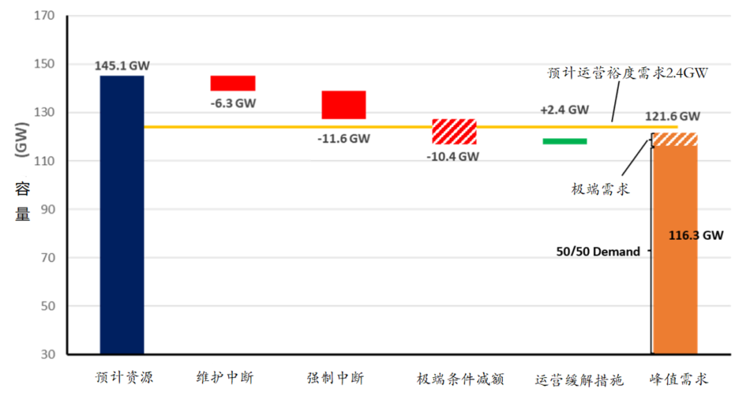 中西部可靠性組織-薩斯克電力公司(MRO-SaskPower):夏季期間,在正常情況下該區(qū)域電力市場不會出現(xiàn)容量限制或可靠性問題。然而,如果發(fā)電機組出現(xiàn)強制中斷(Forced Outages)[13]情況(中斷概率為21.5%,損失出力約35萬千瓦),同時疊加高于歷年均值水平的負荷需求,薩斯克電力公司需從鄰近區(qū)域電力市場短期購電,并啟動需求響應(yīng)、調(diào)整維護計劃以及采取臨時停電等措施,以彌補電力供應(yīng)缺口。