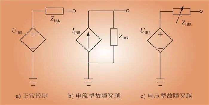 若電源沒(méi)有處于故障穿越控制狀態(tài),逆變器端口的電壓輸出將主要依賴于外環(huán)對(duì)內(nèi)環(huán)所設(shè)定的電壓值。在此情況下,構(gòu)網(wǎng)型變流器的運(yùn)行受給定的無(wú)功功率及并網(wǎng)點(diǎn)電壓的調(diào)控,可被視為一個(gè)受控電壓源與小阻抗的串聯(lián)組合,如圖3所示。圖3中,UIBR為等效電壓源的電壓幅值;IIBR為等效電流源的電流幅值;ZIBR為等效阻抗。