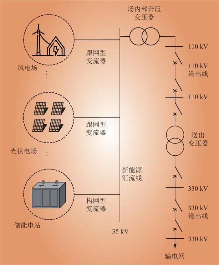 隨著并網(wǎng)新能源規(guī)模的不斷擴(kuò)大,電力系統(tǒng)的故障特性變得日益復(fù)雜,這對(duì)輸電系統(tǒng)中繼電保護(hù)元件的正常運(yùn)作構(gòu)成了更為嚴(yán)重的威脅。特別地,針對(duì)110 kV和330 kV等級(jí)的關(guān)鍵送出線路保護(hù),其適應(yīng)性的提升與改進(jìn)配置方案的制定成為了電力系統(tǒng)運(yùn)行管理部門及繼電保護(hù)設(shè)備制造商共同關(guān)注的焦點(diǎn)問(wèn)題,亟待深入研究與有效解決。主流新能源送出電網(wǎng)結(jié)構(gòu)如圖4所示,其中風(fēng)電和光伏采用跟網(wǎng)型變流器,儲(chǔ)能采用構(gòu)網(wǎng)型變流器。