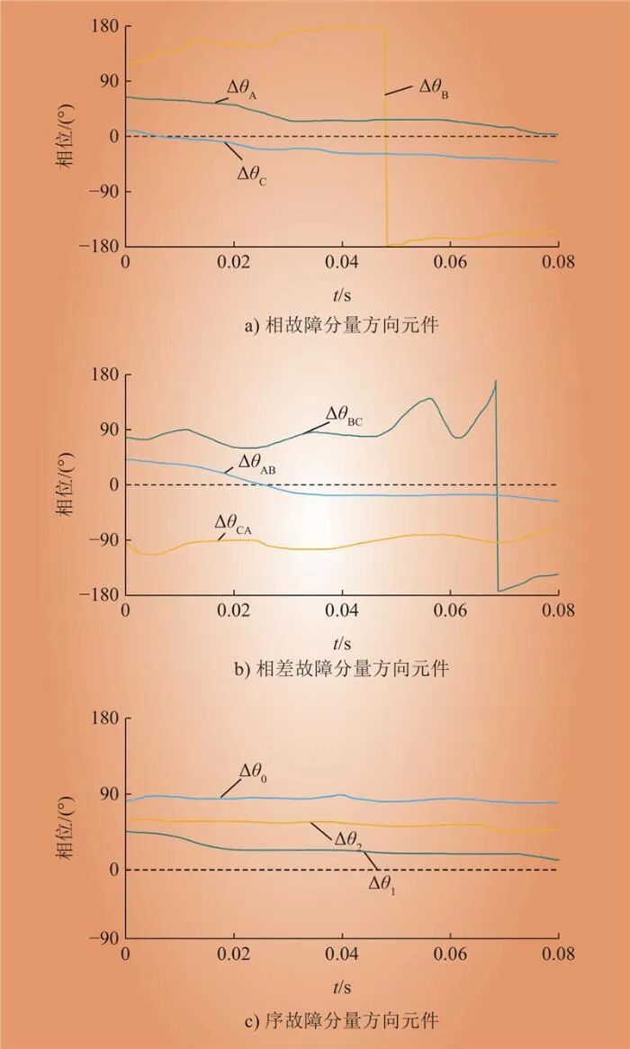 分析圖6可得:構(gòu)網(wǎng)變流側(cè)的正負(fù)序阻抗比kZ12存在一定波動(dòng),由此導(dǎo)致ΔθA、ΔθB、ΔθC、ΔθAB、ΔθBC、ΔθCA呈現(xiàn)出一定程度波動(dòng)性,進(jìn)而影響了相量方向元件故障判斷的穩(wěn)定性。當(dāng)采取特定限流措施時(shí),構(gòu)網(wǎng)變流側(cè)的正序阻抗出現(xiàn)一定程度波動(dòng),導(dǎo)致Δθ1出現(xiàn)一定程度波動(dòng),可能導(dǎo)致正序故障分量方向元件無(wú)法穩(wěn)定判斷。構(gòu)網(wǎng)變流側(cè)的負(fù)序和零序阻抗相對(duì)穩(wěn)定,Δθ2和Δθ0基本穩(wěn)定在動(dòng)作區(qū)內(nèi),因此負(fù)序和零序方向元件均能夠在動(dòng)作區(qū)內(nèi)維持穩(wěn)定。