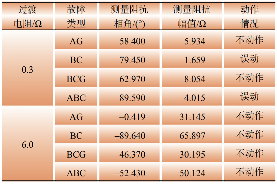 從表2中可以看出,該故障為正方向區(qū)外故障。但當(dāng)存在0.3 Ω的過(guò)渡電阻時(shí),相間短路和三相短路故障的測(cè)量阻抗位于動(dòng)作區(qū)內(nèi),即發(fā)生了穩(wěn)態(tài)超越。由此可得,在發(fā)生正方向區(qū)外故障時(shí),構(gòu)網(wǎng)變流側(cè)距離元件的耐受過(guò)渡電阻能力和提供的故障電流相關(guān),與典型弱饋系統(tǒng)特征較為類似。
