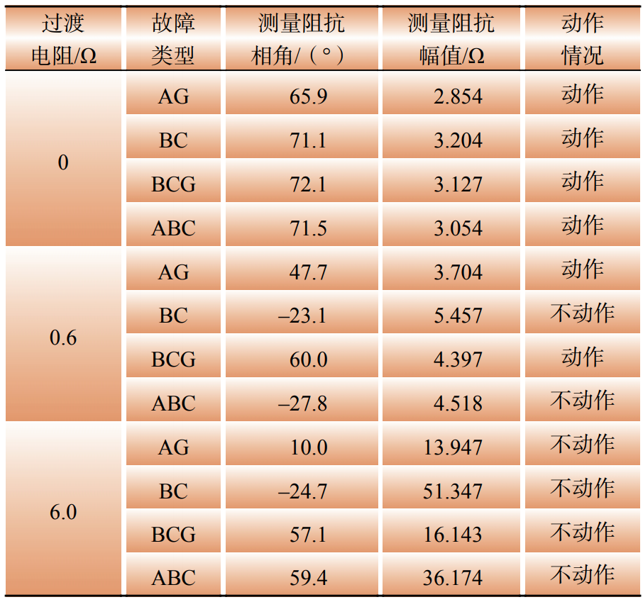 從表3中可以看出,在沒(méi)有過(guò)渡電阻的情況下,測(cè)量阻抗能夠反映保護(hù)與故障位置的線路阻抗,保護(hù)元件能夠正常動(dòng)作。然而,當(dāng)存在0.6 Ω的過(guò)渡電阻時(shí),構(gòu)網(wǎng)變流側(cè)測(cè)量阻抗會(huì)偏移至保護(hù)動(dòng)作區(qū)外。進(jìn)一步地,過(guò)渡電阻增大至6 Ω時(shí),對(duì)于部分故障類型,同樣會(huì)產(chǎn)生偏移。由此推斷,在區(qū)內(nèi)發(fā)生故障的情況下,構(gòu)網(wǎng)變流側(cè)距離保護(hù)元件對(duì)于過(guò)渡電阻的耐受能力和提供的故障電流相關(guān),與典型弱饋系統(tǒng)特征較為類似。