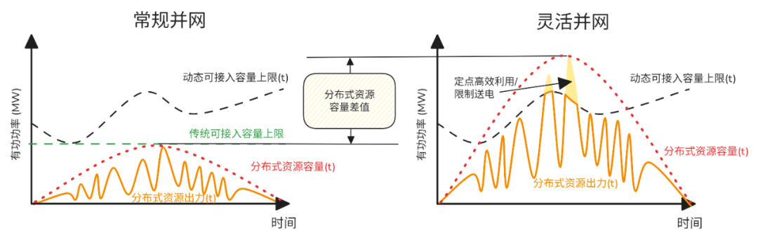 圖1:采用余電上網(wǎng)曲線前后的分布式電源發(fā)電容量及配電承載力對(duì)比[12]