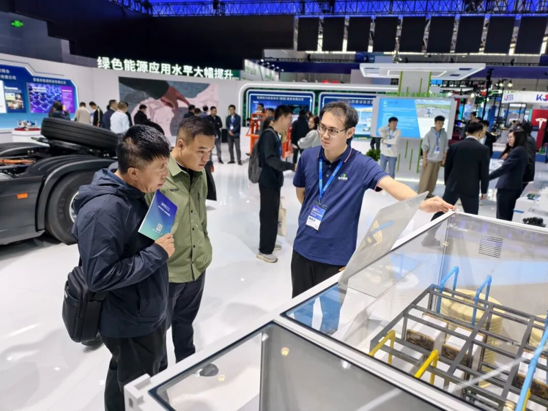 在主題形象展區(qū),國潤儲能重點(diǎn)展示了全釩液流電池儲能系統(tǒng)模型與電堆,闡釋其作為大規(guī)模、長時、高安全“能源銀行”的技術(shù)原理與應(yīng)用價值。國潤的500KW模塊與高質(zhì)量集成交付能力,給現(xiàn)場觀眾及合作伙伴留下深刻印象。在能源科技創(chuàng)新展區(qū),公司集中呈現(xiàn)了在液流電池領(lǐng)域自主研發(fā)的核心材料成果,體現(xiàn)了從關(guān)鍵材料到系統(tǒng)集成的全鏈條技術(shù)實(shí)力。