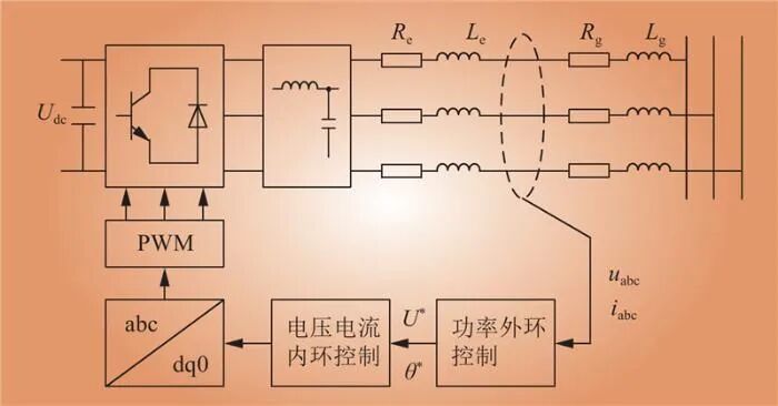 構(gòu)網(wǎng)型控制技術(shù)通過調(diào)節(jié)接入點(diǎn)電壓的幅值和相位來控制注入功率。構(gòu)網(wǎng)型控制策略在運(yùn)行時(shí)采集公共接入點(diǎn)的三相電壓電流信號(hào),通過功率外環(huán)控制形成電壓幅值信號(hào)U*與相位信號(hào)θ*,利用脈沖寬度調(diào)制(pulse width modulation,PWM)技術(shù)生成開關(guān)器件的驅(qū)動(dòng)信號(hào)。構(gòu)網(wǎng)型控制技術(shù)典型控制流程如圖1所示。
