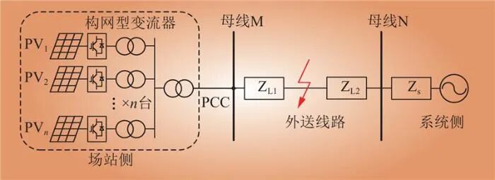 以構(gòu)網(wǎng)型光伏發(fā)電機(jī)組為基礎(chǔ)搭建構(gòu)網(wǎng)型新能源機(jī)組集中外送系統(tǒng),拓?fù)浣Y(jié)構(gòu)如圖2所示。其中,PVn為第n組光伏發(fā)電機(jī)組;PCC為并網(wǎng)點(diǎn);ZL1為故障點(diǎn)至場(chǎng)站側(cè)外送線路的等值阻抗;ZL2為故障點(diǎn)至系統(tǒng)側(cè)外送線路的等值阻抗;Zs為系統(tǒng)側(cè)等值阻抗。