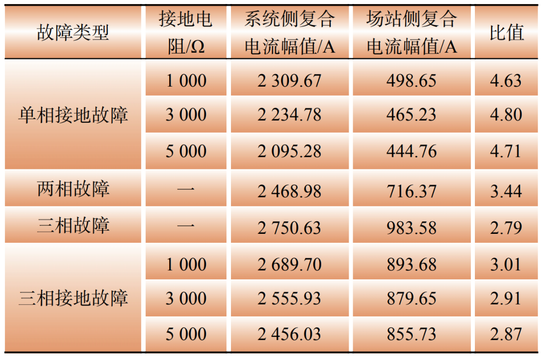 本文設(shè)置不同的故障條件判斷在新能源集中外送場(chǎng)景下,采用的權(quán)重系數(shù)m1=m2=4,故障判別結(jié)果如表1所示。由表1可知,在構(gòu)網(wǎng)型新能源機(jī)組集中外送場(chǎng)景下,此時(shí)由正序分量構(gòu)造的保護(hù)判據(jù)幾乎無效,因此有必要利用復(fù)合序電流判據(jù)識(shí)別故障。當(dāng)外送線路發(fā)生故障時(shí),為正序突變量設(shè)置的權(quán)重會(huì)放大兩側(cè)的故障特征,放大兩側(cè)復(fù)合序電流的幅值差異。其中,若發(fā)生不對(duì)稱故障,則為負(fù)序分量設(shè)置的權(quán)重會(huì)進(jìn)一步放大的兩側(cè)故障特征,使兩側(cè)復(fù)合序電流呈現(xiàn)出明顯差異??梢?,在不同故障條件下系統(tǒng)側(cè)與場(chǎng)站側(cè)的復(fù)合序電流幅值比均大于可靠系數(shù),因此本文提出的復(fù)合序電流判據(jù)可以準(zhǔn)確識(shí)別構(gòu)網(wǎng)型新能源集中外送場(chǎng)景下送出線路的故障。