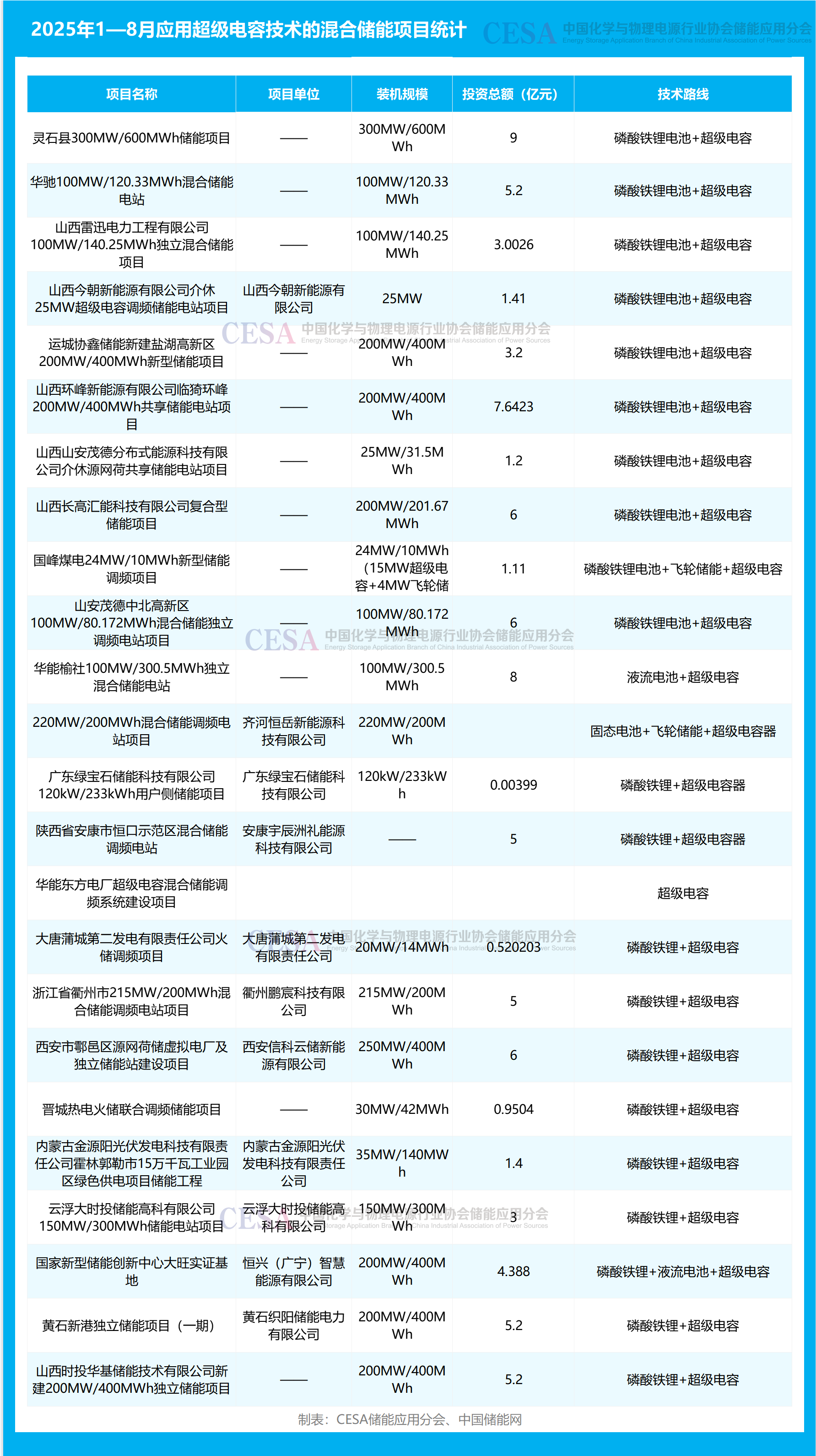 據(jù)CESA儲能應(yīng)用分會(huì)產(chǎn)業(yè)數(shù)據(jù)庫不完全統(tǒng)計(jì),僅2025年1—8月就有28個(gè)混合儲能項(xiàng)目中應(yīng)用了超級電容技術(shù),規(guī)模合計(jì)3639MW/6012.155MWh,總投資103.83億元。