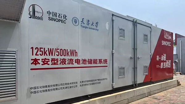 目前,這項技術(shù)成果與中石化銷研院合作,已經(jīng)轉(zhuǎn)化為天津首套125kW/500kWh液流電池儲能系統(tǒng),正在南開區(qū)密云一支路加油站運行,成為光儲充一體化能源系統(tǒng)的心臟。