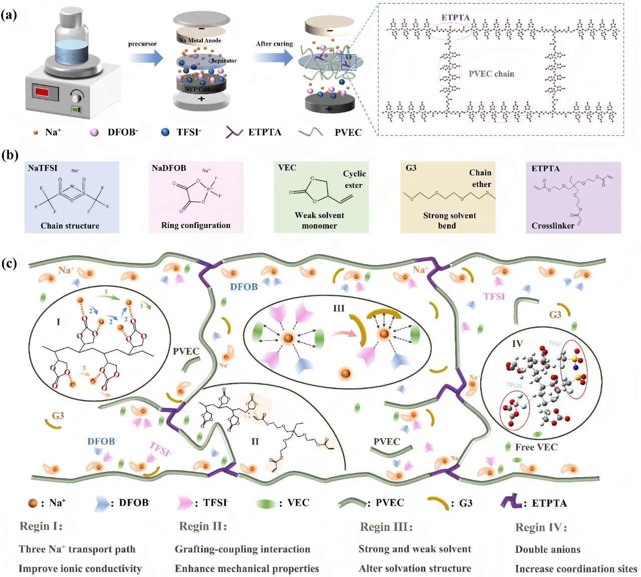 中國儲(chǔ)能網(wǎng)訊:隨著全球能源轉(zhuǎn)型進(jìn)程加速,鈉離子電池因其原材料豐富、成本低廉等優(yōu)勢(shì),正成為大規(guī)模儲(chǔ)能領(lǐng)域的重要選擇。與鋰資源相比,鈉在地殼中的儲(chǔ)量高出三個(gè)數(shù)量級(jí),且原料成本較鋰離子電池可降低30%-40%。然而,傳統(tǒng)鈉離子電池使用的液態(tài)電解質(zhì)存在易泄漏、易燃等安全隱患,使電池安全問題始終如懸頂之劍。數(shù)據(jù)顯示,2024年我國新能源汽車起火事故中,80%由電池?zé)崾Э匾l(fā)。與液態(tài)電解質(zhì)相比,全固態(tài)電解質(zhì)的安全性大幅度提升,但其大規(guī)模應(yīng)用仍受限于其較低的離子電導(dǎo)率和較高的固-固界面阻抗,凝膠聚合物電解質(zhì)作為一種介于液態(tài)和固態(tài)之間的折中方案,既保留了較高的離子電導(dǎo)率,又具備良好的界面相容性和安全性,成為當(dāng)前研究的熱點(diǎn)。