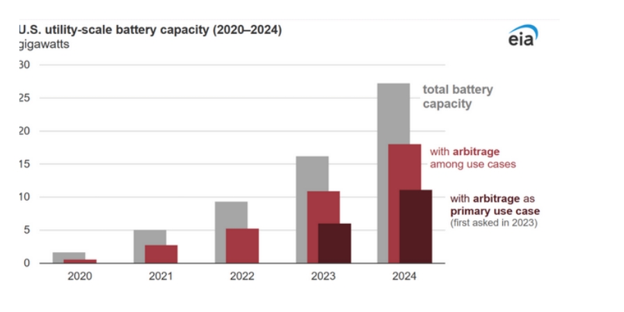 2024年,美國(guó)運(yùn)營(yíng)的公用事業(yè)規(guī)模電池儲(chǔ)能系統(tǒng)約為27GW。其中,約18GW參與套利,約有11GW專門(mén)用于套利。