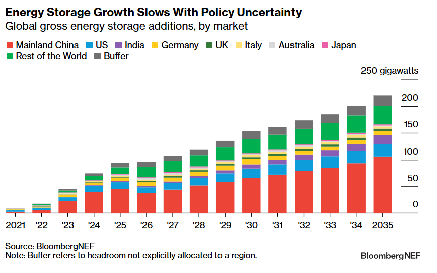 全球儲(chǔ)能市場(chǎng)方面, 盡管美國(guó)和中國(guó)這兩個(gè)最大的儲(chǔ)能市場(chǎng)存在政策變化和不確定性,但全球儲(chǔ)能市場(chǎng)勢(shì)將在2025年再創(chuàng)紀(jì)錄。彭博新能源財(cái)經(jīng)預(yù)計(jì),今年新增裝機(jī)將增長(zhǎng)35%,其中中國(guó)因各地區(qū)共址配建強(qiáng)制要求而將繼續(xù)保持領(lǐng)先地位。在全球范圍內(nèi),大型儲(chǔ)能是預(yù)測(cè)區(qū)期內(nèi)的主要增長(zhǎng)推動(dòng)因素,各大洲都有已投運(yùn)或在建的GWh級(jí)項(xiàng)目。2025年勢(shì)將創(chuàng)下94GW/247GWh的年新增裝機(jī)新紀(jì)錄,隨后復(fù)合年增長(zhǎng)率達(dá)到14.7%,2035年的年新增裝機(jī)將達(dá)到220GW/972GWh。