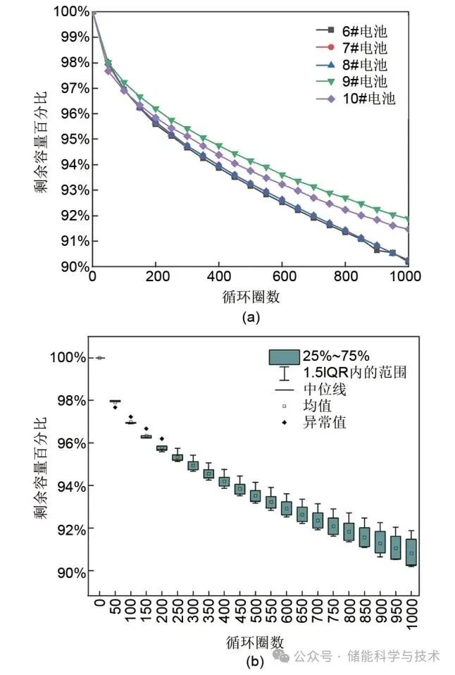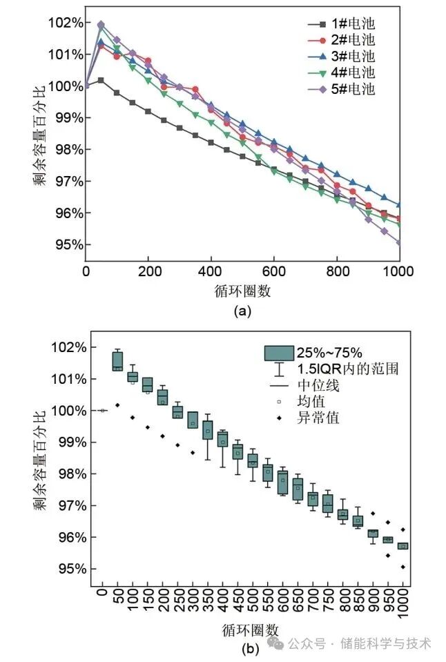 圖2 常溫25 ℃循環(huán)性能:(a) 點(diǎn)線圖;(b) 箱線圖