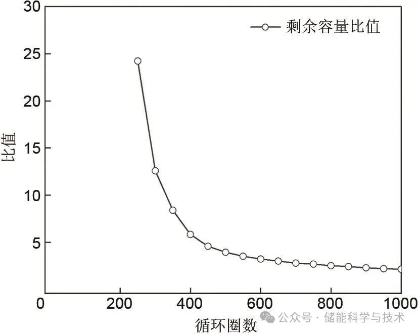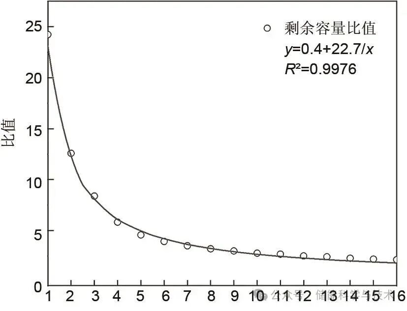 為了繼續(xù)探究環(huán)境溫度對(duì)儲(chǔ)能電池循環(huán)性能的影響,本工作將兩次循環(huán)試驗(yàn)的容量衰減率平均值的比值進(jìn)行函數(shù)擬合。圖4為45 ℃與25 ℃容量衰減率比值,由圖可知,由于常溫測(cè)試的容量在初期階段先增加了一段時(shí)間后才緩慢衰減,因此比值較大,隨著循環(huán)圈數(shù)的逐漸增加,高溫容量衰減率逐漸趨于常溫容量衰減率的2倍,且曲線近似反比例函數(shù)與常數(shù)的和(y=a+b/x)。為簡(jiǎn)化擬合方程,將橫坐標(biāo)250圈定義為1,300圈定義為2,以此類推,1000圈定義為16,函數(shù)擬合結(jié)果如圖5所示。在擬合方程y=a+b/x中,a=0.4,b=22.7,相關(guān)系數(shù)R2=0.9976,表明函數(shù)擬合結(jié)果較好。由于本試驗(yàn)采用的兩種環(huán)境溫度均嚴(yán)格參考了GB/T 36276標(biāo)準(zhǔn)中的規(guī)定,因此試驗(yàn)結(jié)果不僅能夠準(zhǔn)確反映電池在該標(biāo)準(zhǔn)條件下的性能表現(xiàn),還對(duì)其他參考該國(guó)標(biāo)進(jìn)行的循環(huán)試驗(yàn)具有重要的預(yù)測(cè)作用和參考價(jià)值。研究結(jié)論可為電池制造商、檢測(cè)機(jī)構(gòu)以及相關(guān)研究人員提供可靠的數(shù)據(jù)支持,幫助優(yōu)化電池設(shè)計(jì)和測(cè)試方法,同時(shí)為制定和修訂相關(guān)行業(yè)標(biāo)準(zhǔn)提供科學(xué)依據(jù),從而推動(dòng)電池技術(shù)的規(guī)范化發(fā)展。