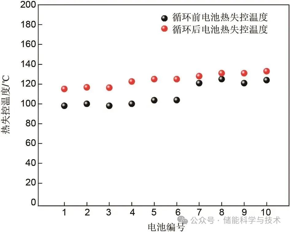 為了探究循環(huán)前后的儲(chǔ)能電池?zé)崾Э販囟鹊年P(guān)系以及循環(huán)后SOH與熱失控溫度之間的關(guān)系,本工作選用來自5個(gè)企業(yè)的10款電池,每款電池選取2個(gè)(共計(jì)20個(gè))分別進(jìn)行循環(huán)前和循環(huán)后的熱失控試驗(yàn)。圖6為循環(huán)前后電池發(fā)生熱失控時(shí)的最高溫度,由圖可知,經(jīng)過高溫加速老化1000圈充放電循環(huán)后的電池?zé)崾Э販囟绕毡楦哂谘h(huán)前的新電池,熱失控溫度分布相對(duì)集中,均在115~135 ℃之間,而循環(huán)前電池的熱失控溫度分布于95~125 ℃。熱失控溫度的顯著差異主要?dú)w因于電池在循環(huán)過程中內(nèi)部組件(如正負(fù)極材料、隔膜和電解質(zhì)等)發(fā)生的結(jié)構(gòu)或物相變化,導(dǎo)致其在熱失控試驗(yàn)過程中擁有更高的溫度觸發(fā)熱失控。在鋰離子電池循環(huán)過程中,負(fù)極表面的SEI膜會(huì)隨著充放電循環(huán)不斷生成并逐漸增厚。這些積累的SEI膜在熱失控試驗(yàn)中會(huì)釋放更多的熱量,熱量會(huì)進(jìn)一步加速剩余SEI膜的分解,形成惡性循環(huán),導(dǎo)致循環(huán)后的電池溫度在短時(shí)間內(nèi)迅速升高至115~135 ℃,同時(shí)SEI膜的分解還會(huì)產(chǎn)生多種氣體產(chǎn)物,主要包括CO2、C2H4和O2等,使得電池內(nèi)部壓力急劇上升,最終導(dǎo)致電池進(jìn)入不可逆的熱失控狀態(tài)。因此,深入理解循環(huán)后鋰離子電池狀態(tài)以及SEI膜在熱失控過程中的作用機(jī)制,對(duì)于后續(xù)開發(fā)有效的熱失控預(yù)警和防護(hù)策略具有重要意義。