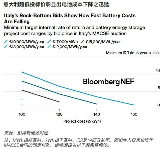 意大利首次大型儲(chǔ)能競(jìng)價(jià)的投標(biāo)價(jià)創(chuàng)下紀(jì)錄低點(diǎn),僅為每年12,000-19,000歐元(13,300-21,000美元)/MWh,遠(yuǎn)低于預(yù)期,彰顯電池成本正大幅下降。在全球供應(yīng)格局變化和價(jià)格競(jìng)爭(zhēng)激烈的背景下,開(kāi)發(fā)商似乎愿意接受接近于零的回報(bào)底線,以確保長(zhǎng)期合同。