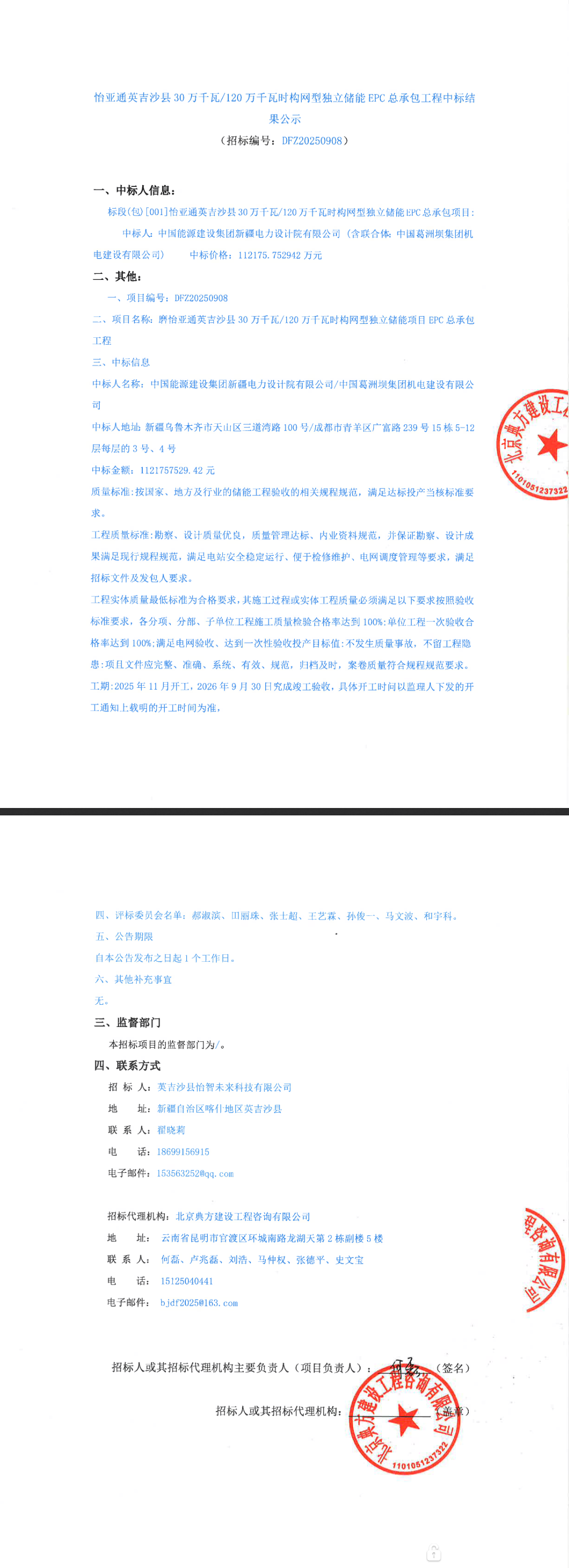 中國儲能網(wǎng)訊:10月13日,英吉沙縣怡智未來科技有限公司發(fā)布怡亞通英吉沙縣30萬千瓦/120萬千瓦時構(gòu)網(wǎng)型獨立儲能EPC總承包工程中標(biāo)結(jié)果公示。中國能源建設(shè)集團新疆電力設(shè)計院有限公司、中國葛洲壩集團機電建設(shè)有限公司聯(lián)合體以112175.752942萬元(折合單價0.935元/Wh)中標(biāo)該項目。