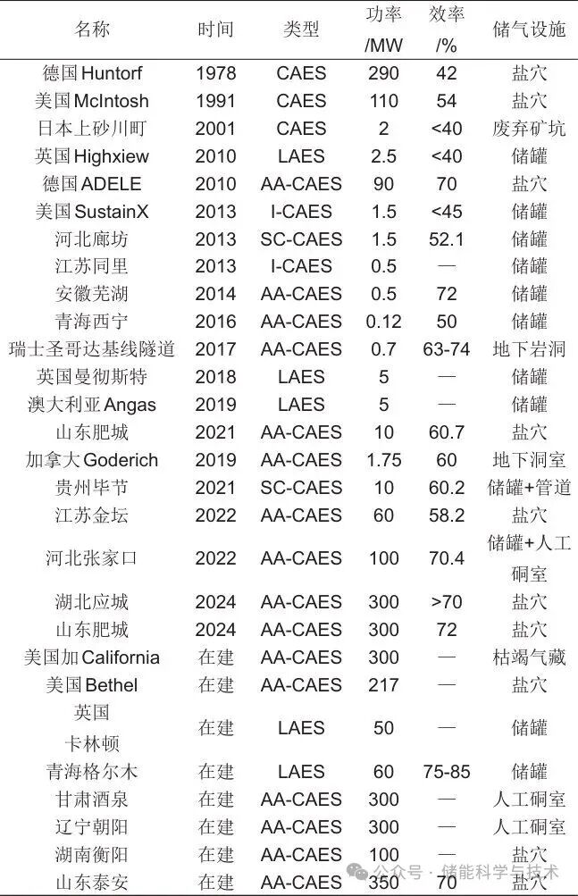 國內(nèi)CAES技術(shù)的起步時(shí)間較晚,2004年起,中國科學(xué)院熱物所、清華大學(xué)、中國科學(xué)院物化所陸續(xù)致力于研究工業(yè)化大規(guī)模非補(bǔ)燃?jí)嚎s空氣儲(chǔ)能系統(tǒng),并開展了相關(guān)試驗(yàn)示范項(xiàng)目。自2021年中鹽、華能、清華共同建設(shè)的金壇儲(chǔ)能電站投產(chǎn)后,我國壓縮空氣儲(chǔ)能逐步進(jìn)入商業(yè)化運(yùn)行階段。2013年,河北廊坊地區(qū)建成了國內(nèi)首套1.5 MW級(jí)別的超臨界壓縮空氣儲(chǔ)能(SC-CAES)示范項(xiàng)目,系統(tǒng)效率達(dá)52.1%;2014年,安徽蕪湖建立了500 kW壓縮空氣儲(chǔ)能(AA-CAES)示范項(xiàng)目,成為國內(nèi)首套絕熱儲(chǔ)能系統(tǒng),電效率41%,綜合能源利用率72%;2021年,中國科學(xué)院熱物所建設(shè)的肥城10 MW鹽穴壓縮空氣儲(chǔ)能電站正式并網(wǎng)發(fā)電,標(biāo)志著國際首個(gè)鹽穴先進(jìn)壓縮空氣儲(chǔ)能電站正式進(jìn)入商業(yè)運(yùn)行狀態(tài);同年,貴州畢節(jié)10 MW先進(jìn)壓縮空氣儲(chǔ)能系統(tǒng)成功并網(wǎng),系統(tǒng)效率60.2%,是國際上首套采用集氣裝置進(jìn)行儲(chǔ)氣的壓縮空氣儲(chǔ)能電站;2022年,中鹽、華能、清華聯(lián)合建設(shè)的金壇壓縮空氣儲(chǔ)能發(fā)電系統(tǒng)(AA-CAES)國家示范項(xiàng)目,發(fā)電功率60 MW,系統(tǒng)效率58.2%;同年,中儲(chǔ)國能建設(shè)河北張家口100 MW壓縮空氣儲(chǔ)能(AA-CAES)電站,電轉(zhuǎn)換率為70.5%;2024年,湖北應(yīng)城300 MW級(jí)壓縮空氣儲(chǔ)能(AA-CAES)電站,提出“絕熱壓縮+寬溫蓄熱+地下儲(chǔ)氣庫”方案,實(shí)現(xiàn)了關(guān)鍵設(shè)備的國產(chǎn)化;同年4月,中儲(chǔ)國能在山東肥城建設(shè)的300 MW/1800 MWh先進(jìn)壓縮空氣儲(chǔ)能國家示范電站并網(wǎng)發(fā)電,系統(tǒng)效率72%。目前,國內(nèi)壓縮空氣儲(chǔ)能較為成熟,形成了以中國科學(xué)院工程熱物理研究所、清華大學(xué)、中能建、中國科學(xué)院物化所主導(dǎo)的AA-CAES、LAES、SC-CAES為代表的先進(jìn)壓縮空氣儲(chǔ)能技術(shù)路線。