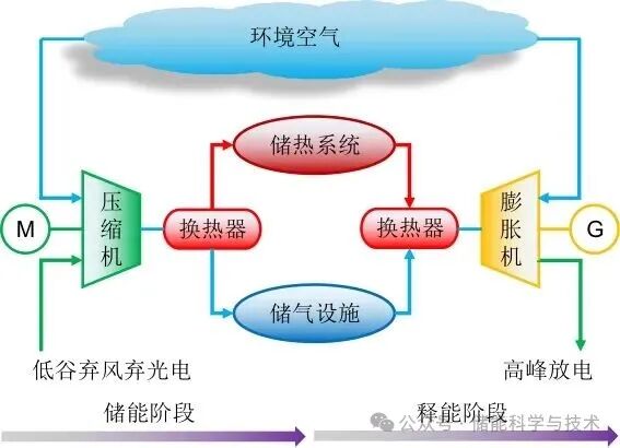 在儲(chǔ)能階段,對(duì)用電低谷、棄風(fēng)棄光等不易儲(chǔ)藏或間歇性強(qiáng)的電能,通過電動(dòng)機(jī)驅(qū)動(dòng)壓縮機(jī)將環(huán)境空氣壓縮成高溫高壓狀態(tài)。壓縮過程中產(chǎn)生的熱量通過換熱器傳遞給儲(chǔ)熱系統(tǒng),而壓縮空氣則被冷卻至接近環(huán)境溫度后儲(chǔ)存于儲(chǔ)氣設(shè)施中。這一步驟將電能轉(zhuǎn)化為空氣的壓力勢(shì)能。