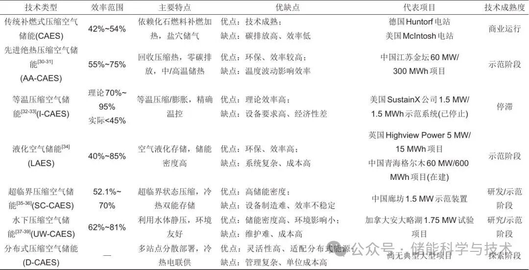 表3 壓縮空氣儲(chǔ)能主要技術(shù)分類及對(duì)比匯總表
