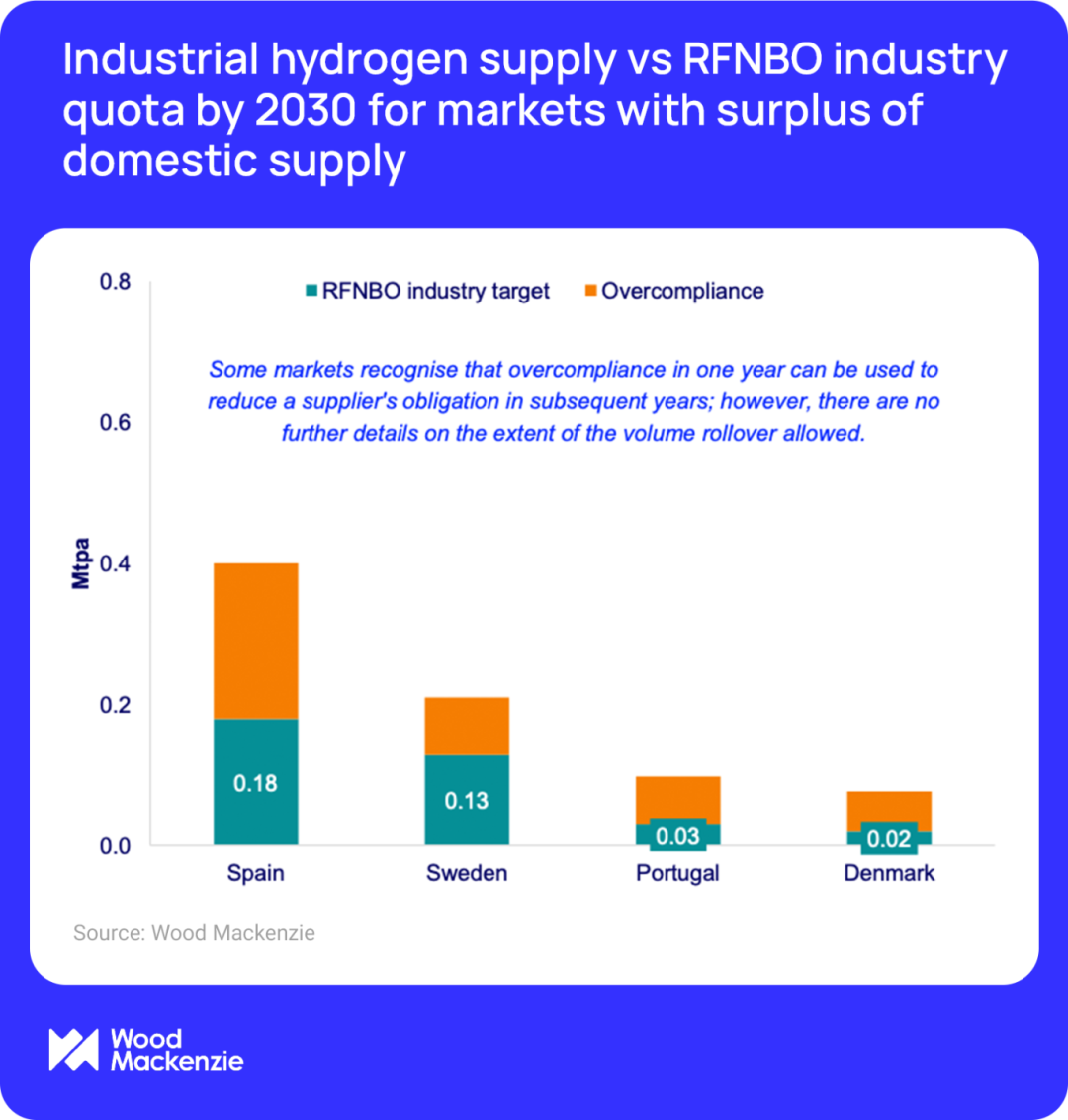 在運輸領(lǐng)域,合規(guī)路徑似乎更為明確,處罰措施能向市場釋放清晰信號。煉油廠路徑正逐漸成為實現(xiàn)合規(guī)的首選方式,但并非所有煉油廠都已落實RFNBO的供應(yīng)渠道和配套基礎(chǔ)設(shè)施。就工業(yè)目標而言,歐盟多數(shù)國家有能力實現(xiàn)42%的RFNBO配額要求。然而,各國在將指令轉(zhuǎn)化為國內(nèi)法律方面進展遲緩,這讓項目開發(fā)商持續(xù)面臨不確定性。伍德麥肯茲分析指出,進口對于滿足工業(yè)配額至關(guān)重要。在歐盟成員國中,僅有西班牙、瑞典、葡萄牙和丹麥能夠依靠國內(nèi)過剩產(chǎn)能完成配額任務(wù)。