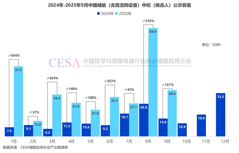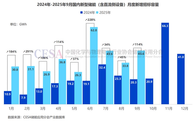 據(jù)CESA儲能應(yīng)用分會產(chǎn)業(yè)數(shù)據(jù)庫不完全統(tǒng)計,2025年9月國內(nèi)新增268個儲能招標(biāo)項目,其中EPC(含直流側(cè)設(shè)備)和儲能系統(tǒng)采購總規(guī)模達(dá)14.8GW/43.6GWh,容量規(guī)模同比增長114%,環(huán)比增長29%。