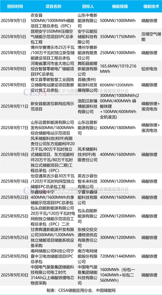 表 2025年9月新增GWh級儲能招標(biāo)項目