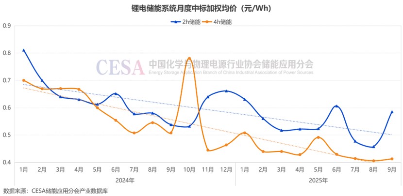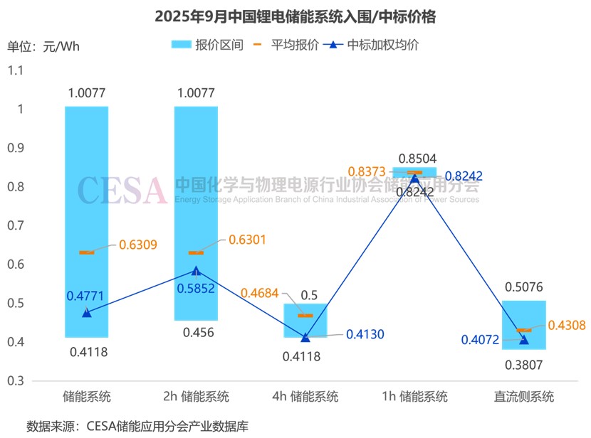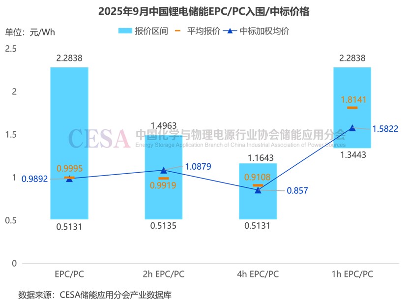 2025年9月,鋰電儲能EPC/PC(不含工商業(yè)儲能柜EPC)入圍報價主要集中在0.5131-2.2838元/Wh區(qū)間內(nèi),平均價格0.9995元/Wh,中標(biāo)加權(quán)均價0.9892元/Wh,環(huán)比+17.57%。
