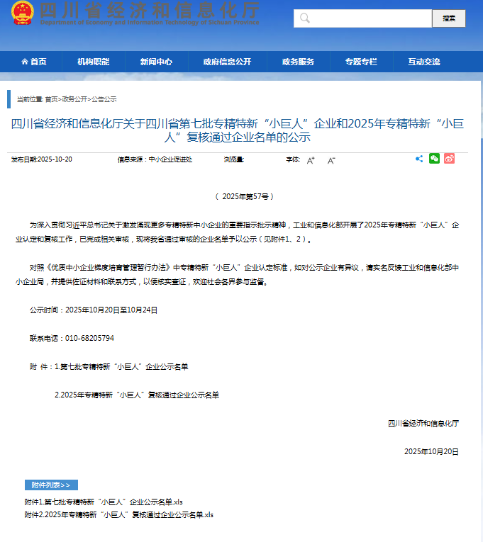 中國儲能網(wǎng)訊:2025年10月20日,四川省經(jīng)濟和信息化廳官網(wǎng)公示了“關(guān)于四川省第七批專精特新“小巨人”企業(yè)和2025年專精特新“小巨人”復(fù)核通過企業(yè)名單的公示”( 2025年第57號)。