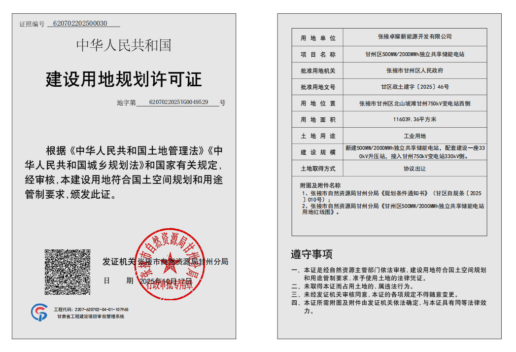 中國儲(chǔ)能網(wǎng)訊:10月17日,甘州區(qū)人民政府發(fā)布《甘州區(qū)500MW/2000MWh獨(dú)立共享儲(chǔ)能電站建設(shè)用地規(guī)劃許可證批后公示》。項(xiàng)目建設(shè)單位為張掖卓耀新能源開發(fā)有限公司,項(xiàng)目位于甘肅省張掖市甘州區(qū)北山坡灘甘州750kV變電站西側(cè),用地面積116039.36平方米。項(xiàng)目新建500MW/2000MWh獨(dú)立共享儲(chǔ)能電站,配套建設(shè)一座330kV升壓站,接入甘州750kV變電站330kV側(cè)。