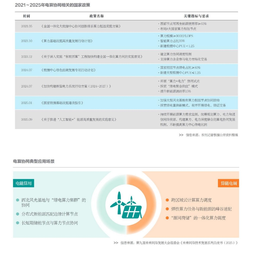 國家層面的電算協同體系仍處于探索完善階段。在跨區(qū)域電力網和算力網協同方面,系統性頂層設計正在構建中:交易層面,2024年發(fā)布的《電力中長期交易基本規(guī)則—綠色電力交易專章》已把數據中心綠電交易納入跨省區(qū)交易品類,累計完成數據中心綠電跨省交易42億千瓦時;但在調度層面,現階段“東數西算”與“西電東送”尚未形成機制合力,能源與信息領域的行業(yè)壁壘,導致跨區(qū)域、跨時間尺度的統一調度體系尚未建立。加之跨域算力調度可能引發(fā)的業(yè)務穩(wěn)定風險,算力服務商等主體參與協同的積極性不強。