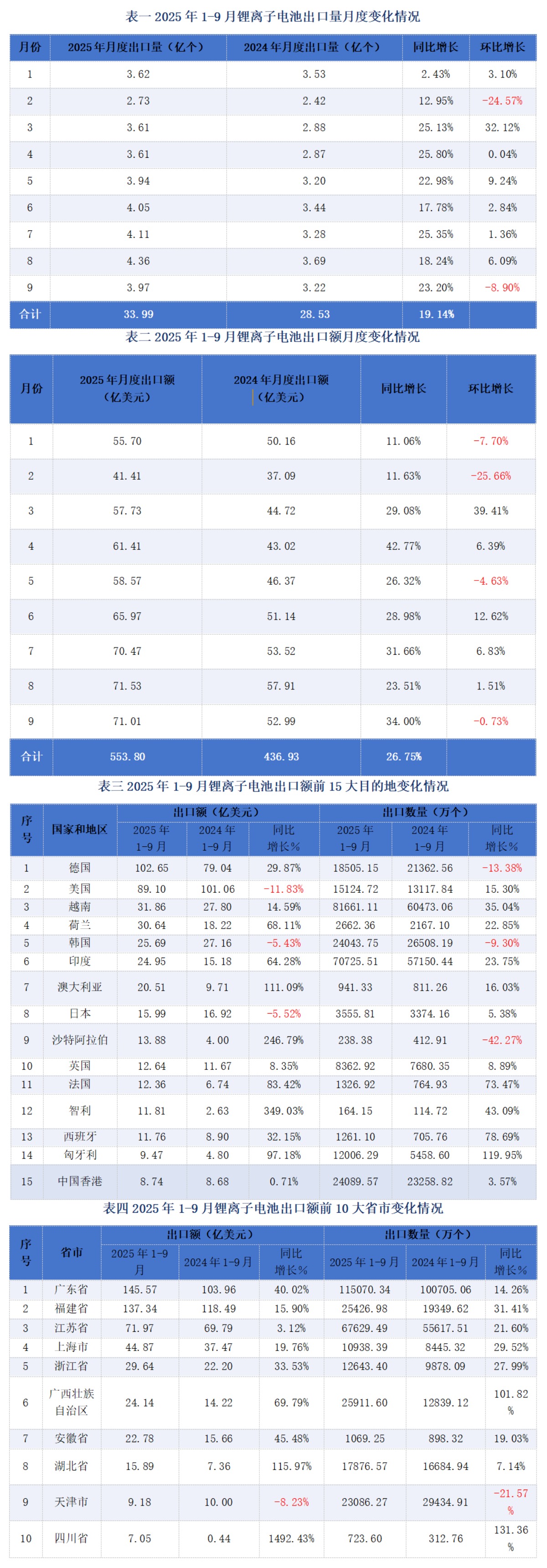 根據(jù)海關(guān)最新統(tǒng)計數(shù)據(jù),2025年1-9月鋰離子電池出口數(shù)量為33.99億個,同比增長19.14%;2025年1-9月我國鋰離子電池出口額為553.8億美元,同比增加26.75%,延續(xù)了穩(wěn)定增長勢頭。其中,2025年9月份,出口額71.01億美元,同比減少0.73%,9月份,出口數(shù)量為3.97億個,同比減少8.9%。
