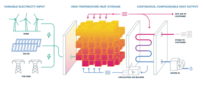 該項(xiàng)目采用Rondo Energy創(chuàng)新研發(fā)的熱電池儲(chǔ)熱技術(shù)——以耐火磚為儲(chǔ)熱介質(zhì)僅由“磚塊和電線”構(gòu)成。這些經(jīng)過特殊處理的耐火磚,通過電阻加熱可將溫度提升至1000℃以上,實(shí)現(xiàn)超過97%的往返效率。熱電池在電價(jià)最低的6小時(shí)內(nèi)充電,可利用離網(wǎng)光伏或電網(wǎng)電力,從而大幅降低運(yùn)行成本。