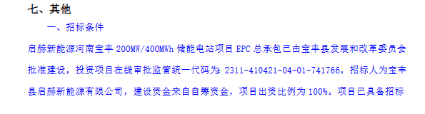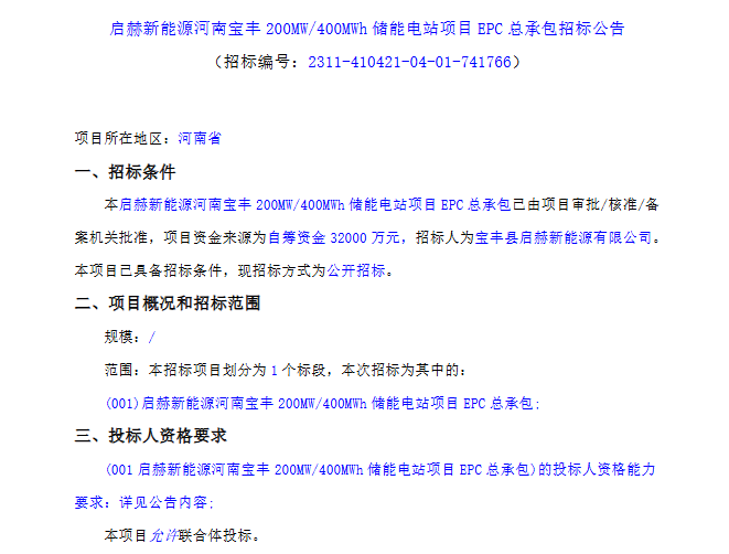 中國儲能網(wǎng)訊:寶豐縣啟赫新能源有限公司發(fā)布河南寶豐200MW/400MWh儲能EPC招標公告,項目資金來源為自籌資金32000萬元,約合單價0.8元/Wh,項目位于河南平頂山。