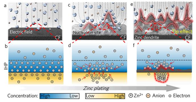 鋅陽極性能取決于鋅離子在電極-電解液界面的有序遷移與沉積。充電時,鋅離子經(jīng)IHP(亥姆霍茲平面,類似于電極和電解液之間的緩沖區(qū))遷移至電極表面成核沉積;放電時則反向遷移。初始循環(huán)中,IHP內(nèi)鋅離子與電場分布均勻,鋅離子可均勻沉積(圖1.a、圖1.b);但循環(huán)次數(shù)增加后,電極表面突起、缺陷等高表面能區(qū)域會富集鋅離子與電場,誘發(fā)尖端效應(yīng)(圖1.c、圖1.d),進而加劇鋅離子的不均勻沉積,促使枝晶形成與生長(圖1.e),最終,持續(xù)生長的枝晶將導(dǎo)致IHP局部區(qū)域鋅離子耗盡、電荷分布嚴重失衡,進而引發(fā)電池內(nèi)部短路(圖1.f)。