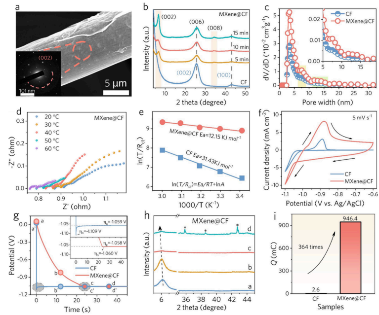 圖2.a MXene@CF電極的掃描電鏡圖像,插圖為SAED衍射圖譜以驗證層狀結(jié)構(gòu);b CF與MXene@CF電極在不同鋅沉積時間下的XRD圖譜;c CF與MXene@CF電極的孔徑分布;d MXene@CF電極的溫度依賴性EIS譜;e CF與MXene@CF電極的電荷轉(zhuǎn)移電阻阿倫尼烏斯曲線;f CF與MXene@CF電極在5 mV s?1下的循環(huán)伏安曲線;g CF與MXene@CF電極在鋅沉積過程中的恒電位曲線;插圖:成像區(qū)域的放大視圖;h MXene@CF電極的XRD圖譜對應(yīng)不同恒電流階段(g圖a?d),星號標(biāo)記對應(yīng)金屬鋅的特征峰;i CF與MXene@CF電極達到鋅成核電位所需的理論電荷量