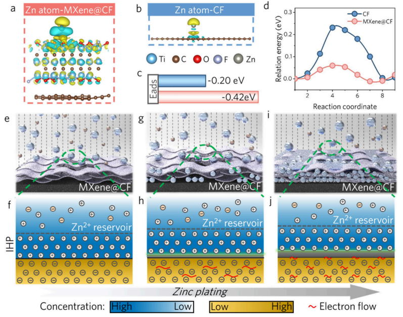 DFT計算表明,MXene@CF與鋅離子的界面相互作用更強,鋅離子吸附能(-0.42 eV)為普通碳氈(-0.20 eV)的2倍,且鋅離子遷移能壘顯著降低,可促進均勻擴散(圖3.a-d)。該特性使MXene@CF能通過鋅離子儲層去穩(wěn)定IHP內(nèi)的離子與電場分布,協(xié)同抑制枝晶與極化(圖3.e-j)。