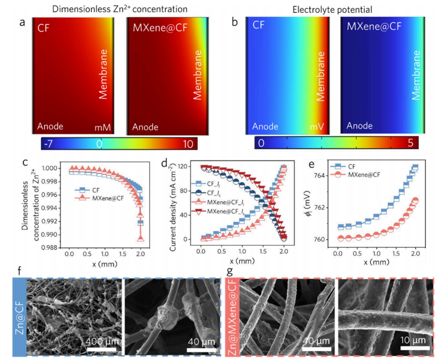SEM觀察顯示,普通碳氈表面鋅沉積呈無序團簇與枝晶(圖4.f),而MXene@CF表面形成了致密均勻鋅層(圖4.g);數(shù)值模擬證實,MXene@CF電極表面的鋅離子濃度與電場分布更均勻(圖4.a-e)。