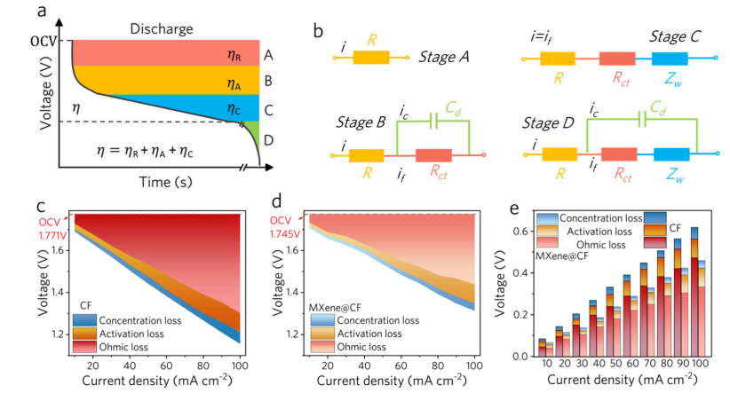 圖5.a ZBFBs放電過程中電壓損失分解示意圖,展示歐姆損失(ηR)、活化損失(ηA)和濃差極化(ηC)的貢獻;b各極化階段對應(yīng)的等效電路模型:階段A(歐姆損失,R);階段B(活化損失,Rct和Cd);階段C(濃度損失,Zw);綜合所有極化組件的整體等效電路;c、d不同電流密度下基于CF和MXene@CF的ZBFBs極化分布,分別顯示歐姆損失、活化損失和濃度損失的貢獻;e CF與MXene@CF電極在不同電流密度(10?100 mA cm?2)下的量化電壓損失