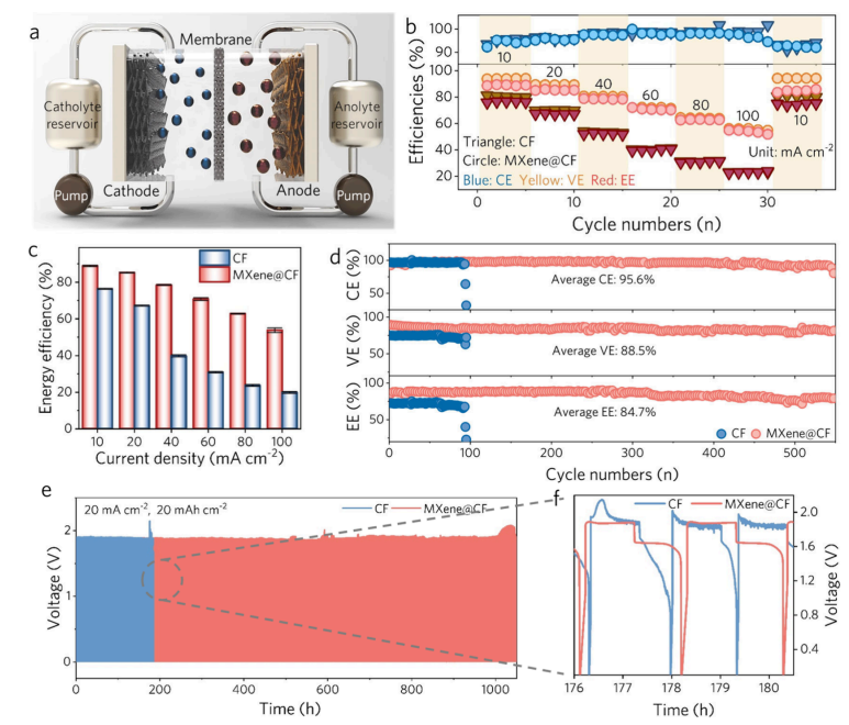 圖6.a ZBFBs工作原理示意圖;b ZBFBs在不同電流密度(10-100 mA·cm-2)下使用CF和MXene@CF電極的倍率性能測試;c不同電流密度下CF基與MXene@CF基ZBFBs的平均能量效率對比;d在20 mA·cm-2和20 mAhcm-2條件下,CE、VE及EE的長期循環(huán)性能測試;e CF基與MXene@CF基ZBFBs在相同條件下的時-電壓曲線;f相同條件下約180小時的GCD曲線放大圖